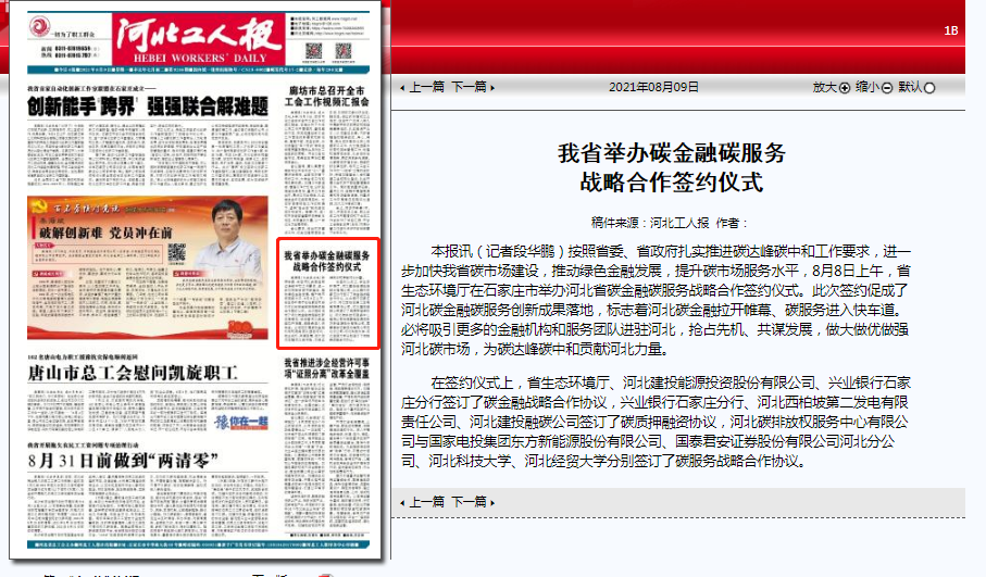 在石家庄市举办河北省碳金融碳服务战略合作签约仪式。此次签约促成了河北碳金融碳服务创新成果落地,标志着河北碳金融拉开帷幕、碳服务进入快车道。必将吸引更多的金融机构和服务团队进驻河北,抢占先机、共谋发展,做大做优做强河北碳市场,为碳达峰碳中和贡献河北力量。