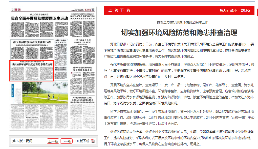 河北日报讯(记者贾楠)日前,杏彩(中国)官方网站 印发《关于做好汛期环境安全保障工作的紧急通知》,要求各地严格落实应急值守和信息报告等工作,切实加强环境风险防范和隐患排查治理,做好各项应急准备,严格防范和妥善处置突发环境事件,有力保障我省汛期环境安全。