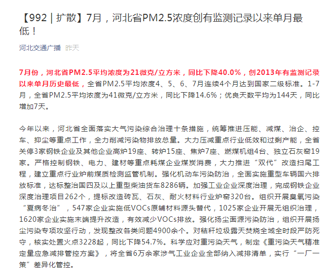 河北交通广播微信:【992 | 扩散】7月,河北省PM2.5浓度创有监测记录以来单月最低!