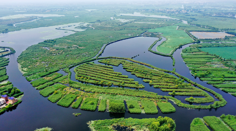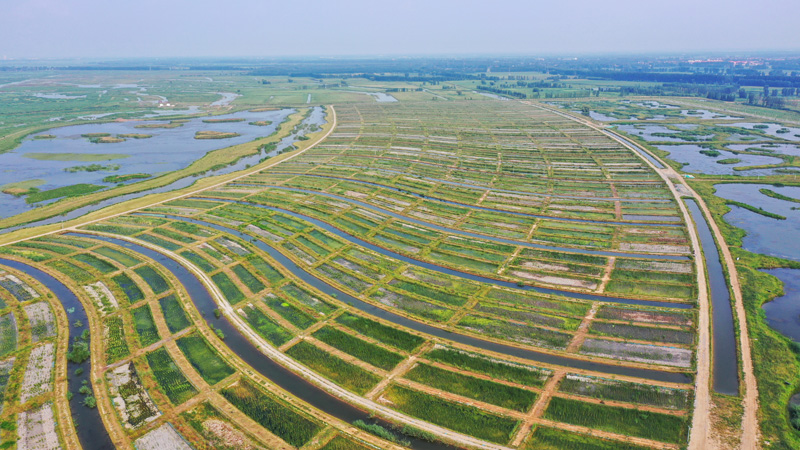 这是雄安新区府河河口湿地水质净化工程现场,府河常年有水入白洋淀(8月14日摄,无人机照片)。