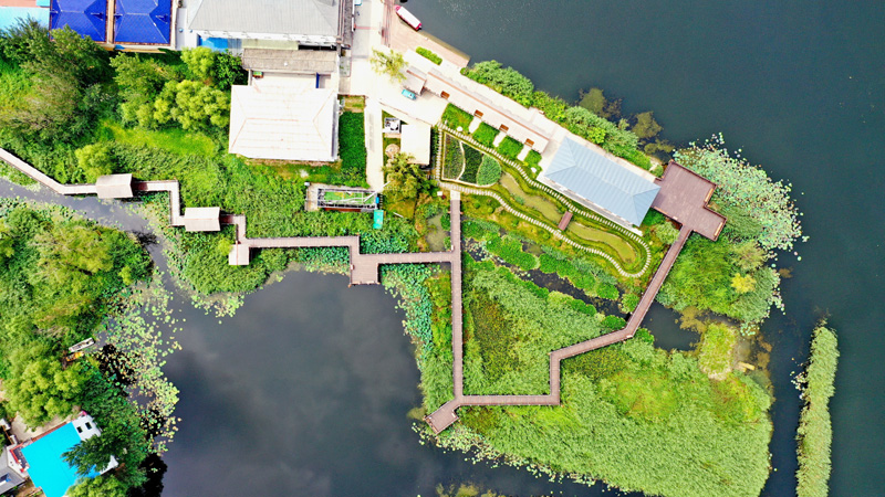 这是白洋淀区安新县圈头乡邵庄子村内经过改造后建设的游园(8月14日摄,无人机照片)。