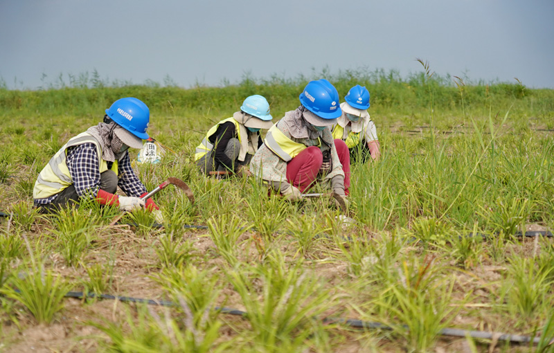 8月14日,工人在雄安新区藻苲淀退耕还淀湿地恢复工程项目区内清理杂草。
