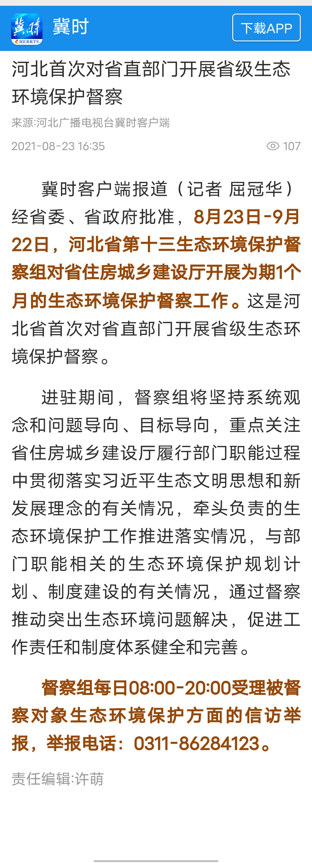 河北广播电视台冀时客户端:河北首次对省直部门开展省级生态环境保护督察