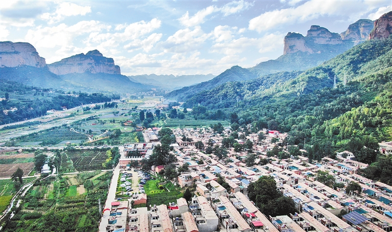 图为被太行山环抱的武安市楼上村。近年来,武安市依托独特的太行山美景,以“山居戏乡”为主题,采取“旅游+”“文化+”模式,打造了集游、购、娱为一体的精品戏曲小镇,吸引了众多游客前来观光,楼上村走出一条特色致富路。 河北日报记者 张 昊摄