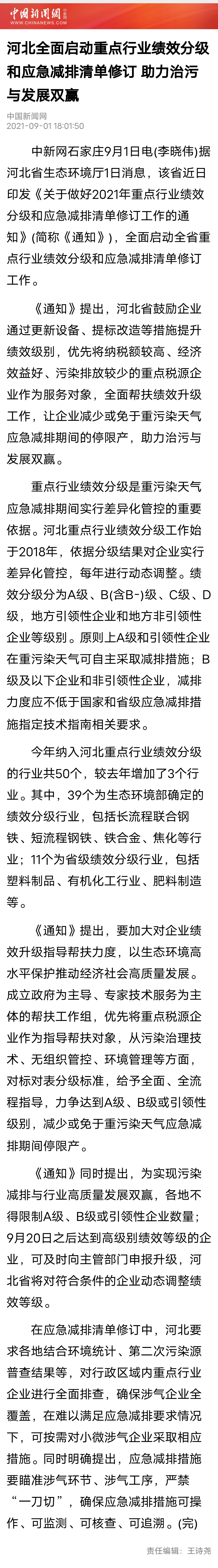 中国新闻网:河北全面启动重点行业绩效分级和应急减排清单修订 助力治污与发展双赢