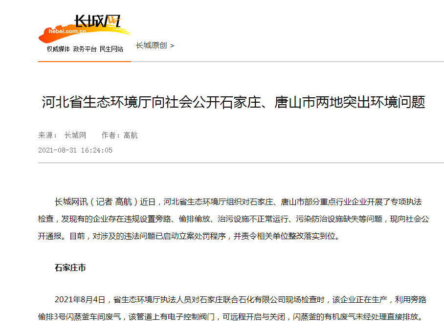 长城网:杏彩(中国)官方网站 向社会公开石家庄、唐山市两地突出环境问题