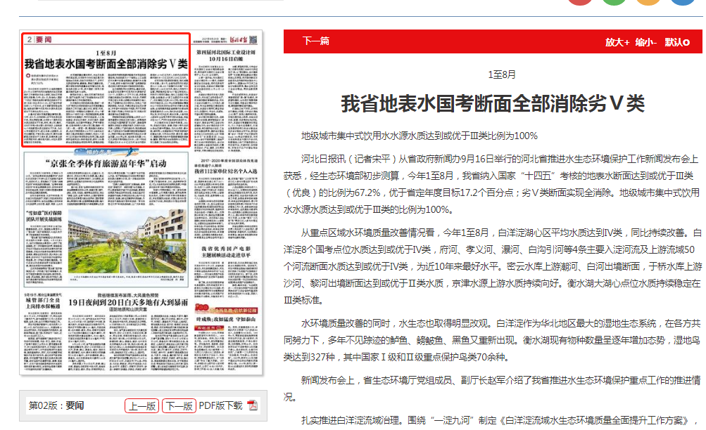 河北日报:1至8月 我省地表水国考断面全部消除劣Ⅴ类