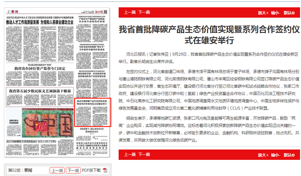 河北日报:我省首批降碳产品生态价值实现暨系列合作签约仪式在雄安举行