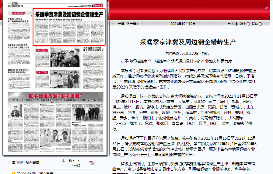 河北工人报:采暖季京津冀及周边钢企错峰生产