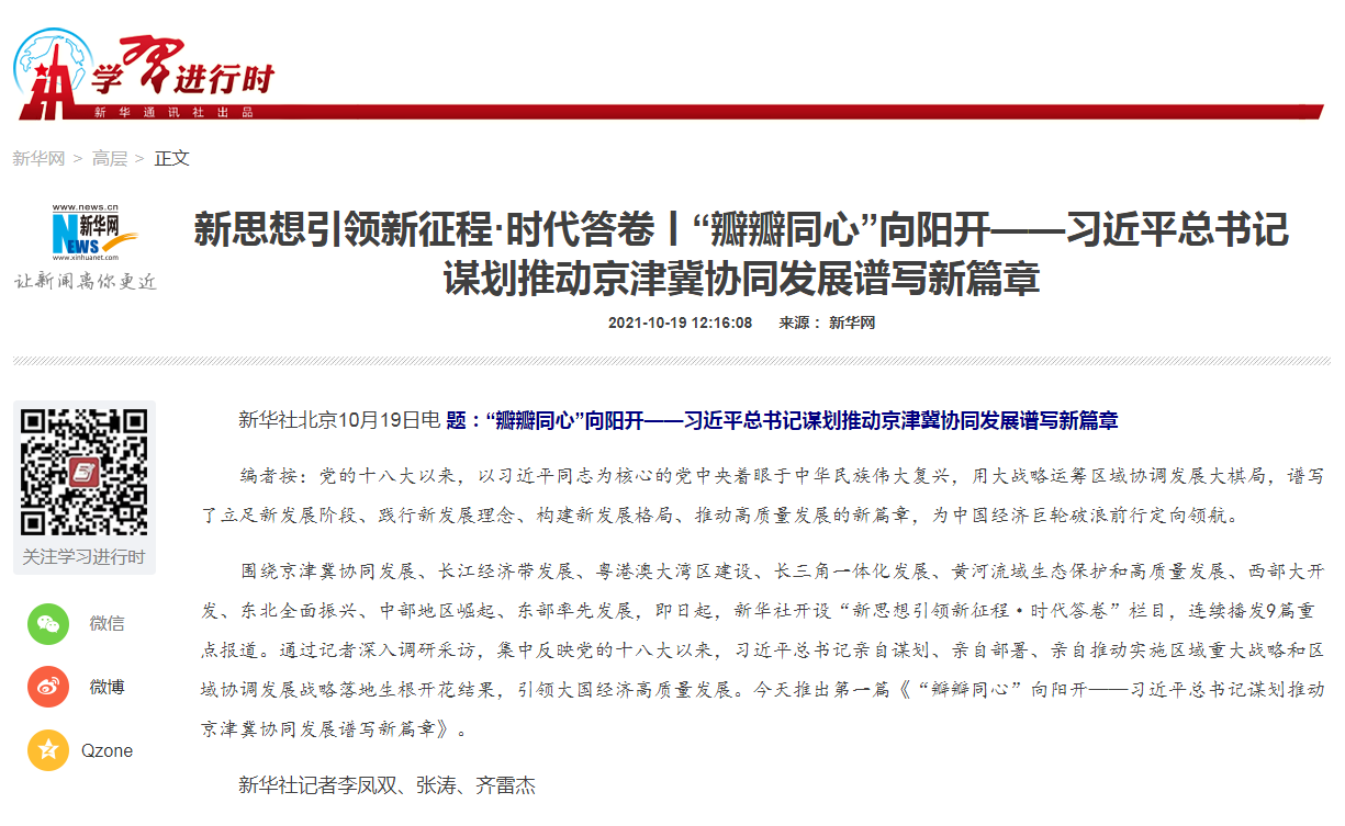 新华社:新思想引领新征程·时代答卷丨“瓣瓣同心”向阳开——习近平总书记谋划推动京津冀协同发展谱写新篇章