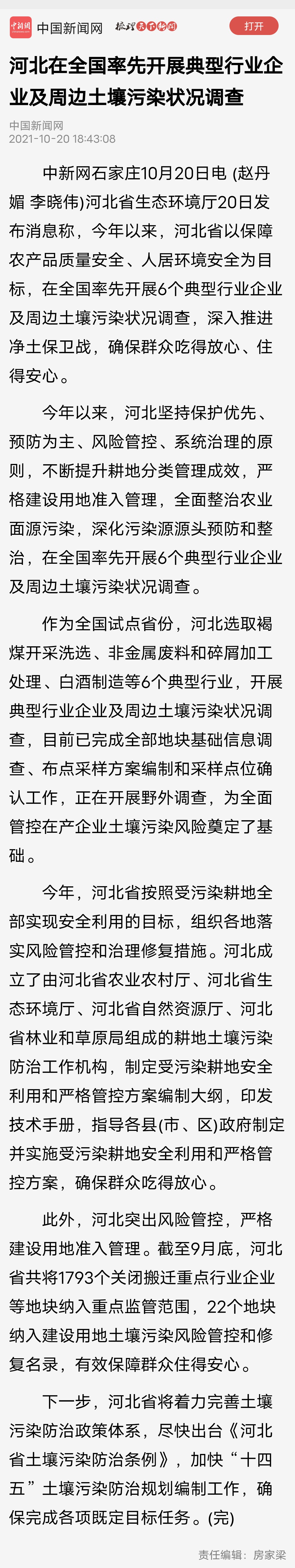 中国新闻网:河北在全国率先开展典型行业企业及周边土壤污染状况调查