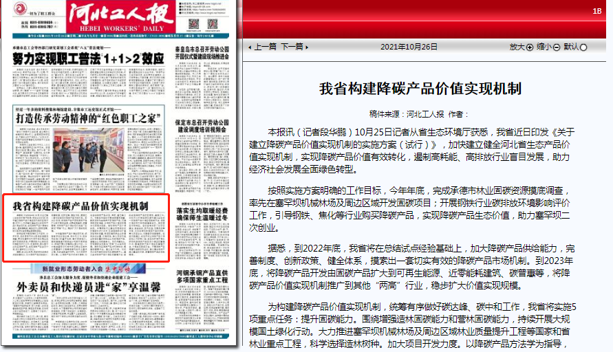河北工人报:我省构建降碳产品价值实现机制