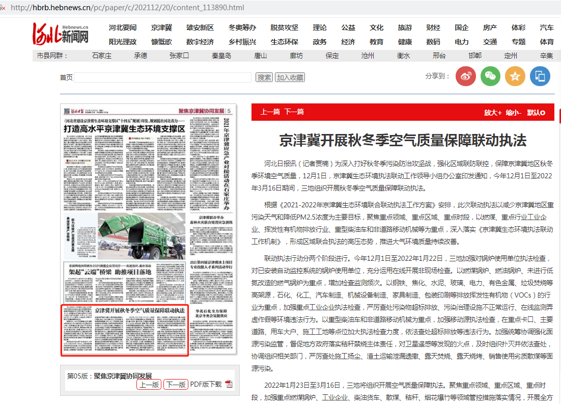 河北日报:京津冀开展秋冬季空气质量保障联动执法