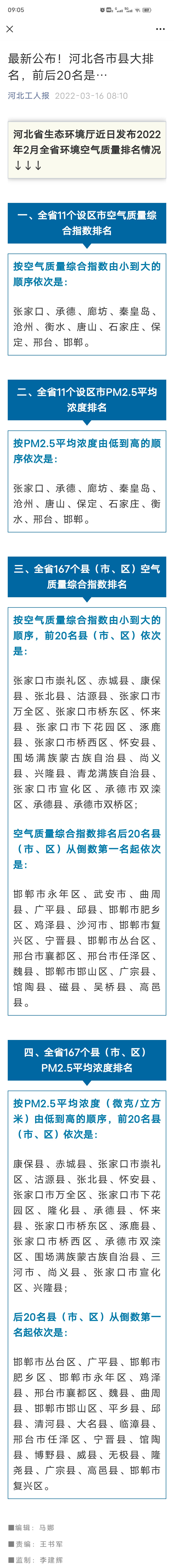 长城网:河北省公布2022年2月全省环境空气质量排名