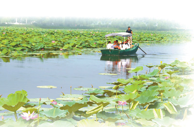游人泛舟白洋淀。