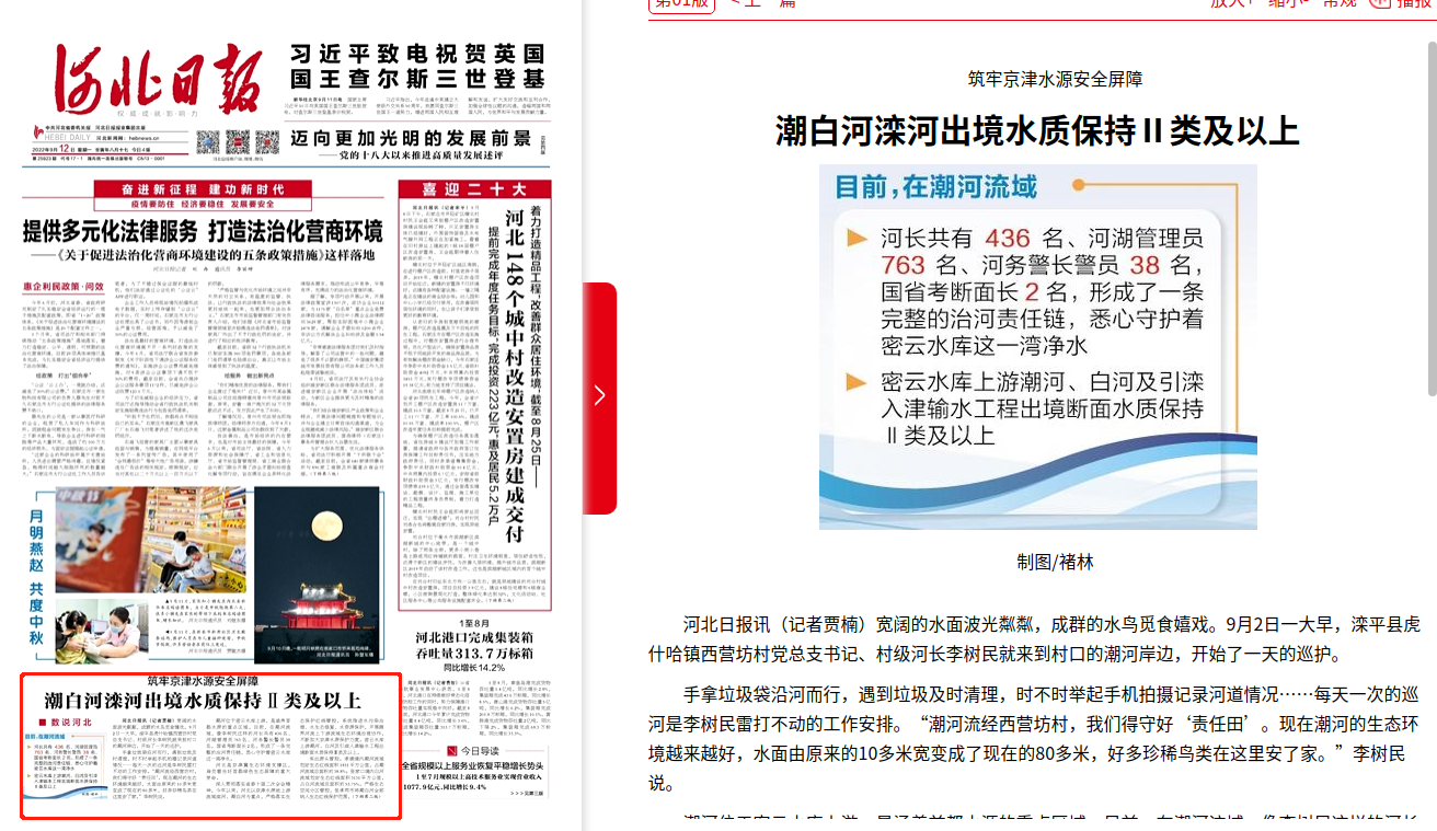 河北日报:筑牢京津水源安全屏障 潮白河滦河出境水质保持Ⅱ类及以上