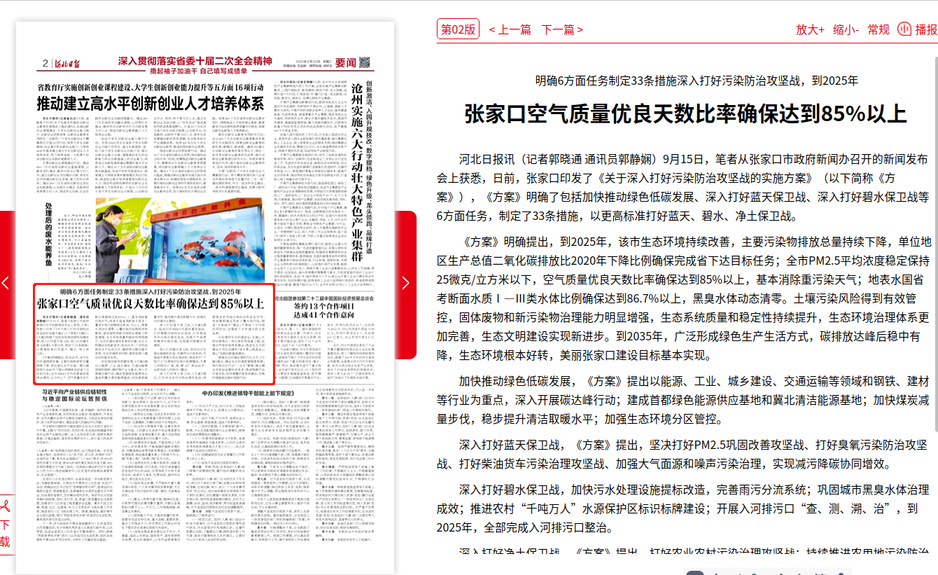 河北日报:明确6方面任务制定33条措施深入打好污染防治攻坚战,到2025年张家口空气质量优良天数比率确保达到85%以上