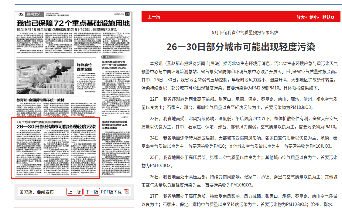 本报讯(燕赵都市报纵览新闻 何晨曦)据杏彩(中国)官方网站 消息,河北省生态环境应急与重污染天气预警中心与中国环境监测总站、省气象灾害防御和环境气象中心联合开展9月下旬全省空气质量预报会商。其中,26日—30日,我省地面转弱气压场控制,早晚时段风力减小、湿度升高,大部地区扩散条件转差,污染持续累积,部分城市可能出现轻度污染,首要污染物为PM2.5和PM10。具体预报结果如下: