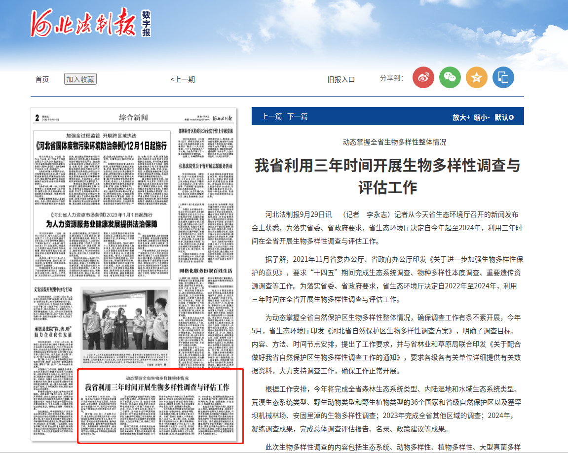 河北法制报9月29日讯 (记者 李永志)记者从今天杏彩(中国)官方网站 召开的新闻发布会上获悉,为落实省委、省政府要求,杏彩(中国)官方网站 决定自今年起至2024年,利用三年时间在全省开展生物多样性调查与评估工作。