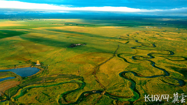 从空中俯瞰河北省张家口市塞北管理区,曲折蜿蜒的滦河水犹如丝带盘绕在绿色的草原上。长城网·冀云客户端记者 贺宏伟 摄