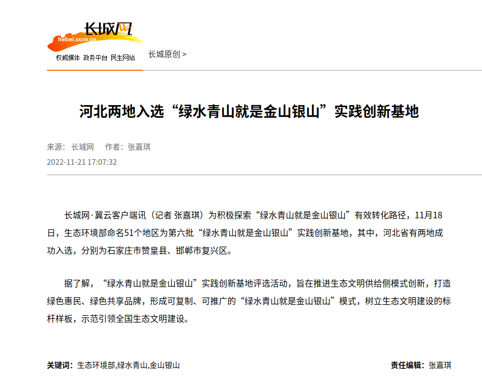 长城网:河北两地入选“绿水青山就是金山银山”实践创新基地 来源:长城网 时间:2022-11-21