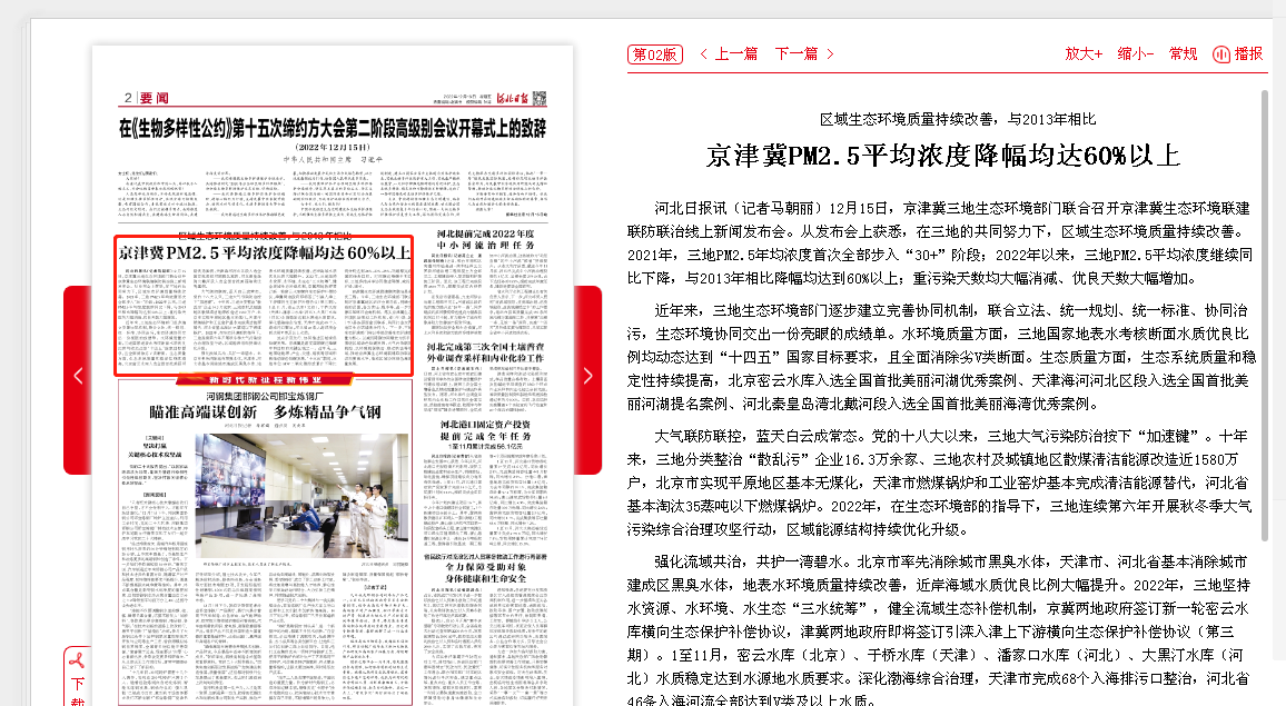 河北日报:区域生态环境质量持续改善,与2013年相比 京津冀PM2.5平均浓度降幅均达60%以上