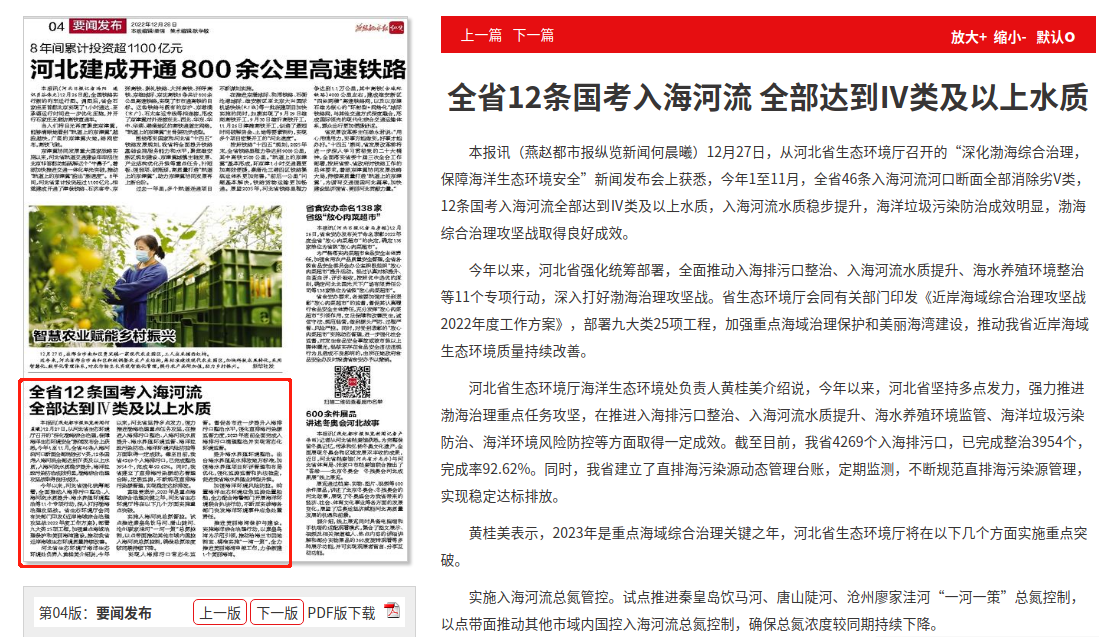 本报讯(燕赵都市报纵览新闻何晨曦)12月27日,从杏彩(中国)官方网站 召开的“深化渤海综合治理,保障海洋生态环境安全”新闻发布会上获悉,今年1至11月,全省46条入海河流河口断面全部消除劣V类,12条国考入海河流全部达到Ⅳ类及以上水质,入海河流水质稳步提升,海洋垃圾污染防治成效明显,渤海综合治理攻坚战取得良好成效。