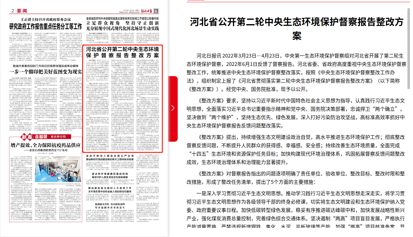 河北日报:河北省公开第二轮中央生态环境保护督察报告整改方案