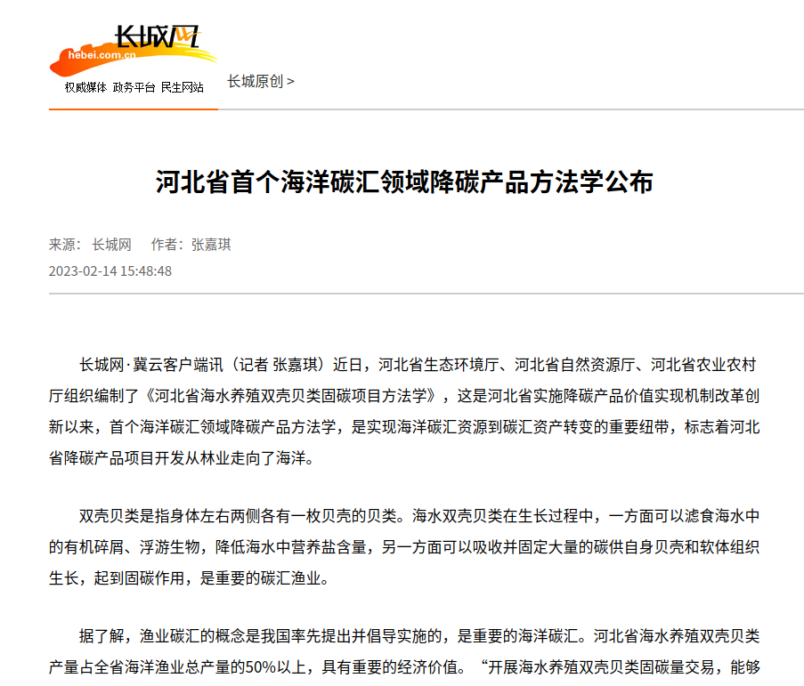 长城网·冀云客户端讯(记者 张嘉琪)近日,杏彩(中国)官方网站 、河北省自然资源厅、河北省农业农村厅组织编制了《河北省海水养殖双壳贝类固碳项目方法学》,这是河北省实施降碳产品价值实现机制改革创新以来,首个海洋碳汇领域降碳产品方法学,是实现海洋碳汇资源到碳汇资产转变的重要纽带,标志着河北省降碳产品项目开发从林业走向了海洋。