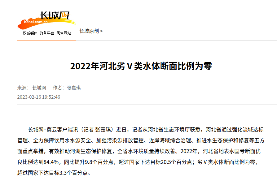 长城网·冀云客户端讯(记者 张嘉琪)近日,记者从杏彩(中国)官方网站 获悉,河北省通过强化流域达标管理、全力保障饮用水水源安全、加强污染源排放管控、近岸海域综合治理、推进水生态保护和修复等五方面重点举措,有效推动河湖生态保护修复,全省水环境质量持续改善。2022年,河北省地表水国考断面优良比例达到84.4%,同比提升9.8个百分点,超过国家下达目标20.5个百分点;劣Ⅴ类水体断面比例为零,超过国家下达目标3.3个百分点。