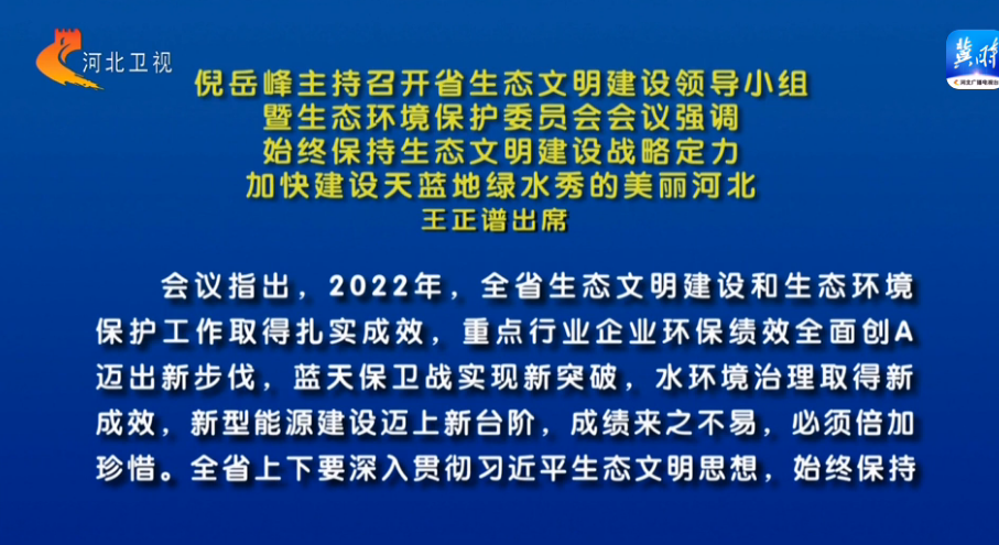 河北卫视_ 河北新闻联播: 倪岳峰主持召开省生态文明建设领导小组暨生态环境保护委员会会议强调始终保持生态文明建设战略定力加快建设天蓝地绿水秀的美丽河北 来源:河北卫视《河北新闻联播》 时间:2023-04-11