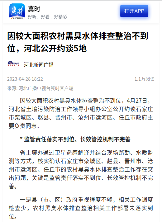河北广播电视台冀时客户端:因较大面积农村黑臭水体排查整治不到位,河北公开约谈5地