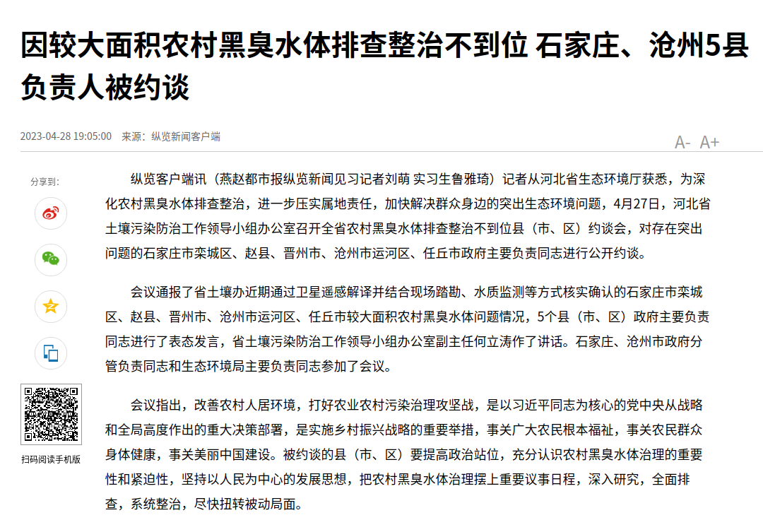 纵览新闻客户端:因较大面积农村黑臭水体排查整治不到位 石家庄、沧州5县(市、区)政府主要负责人被约谈