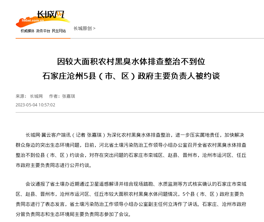 长城网:因较大面积农村黑臭水体排查整治不到位 石家庄沧州5县(市、区)政府主要负责人被约谈