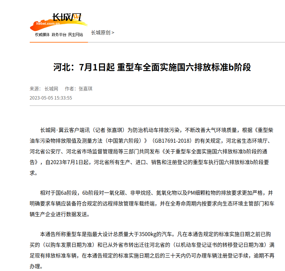 长城网·冀云客户端讯(记者 张嘉琪)为防治机动车排放污染,不断改善大气环境质量,根据《重型柴油车污染物排放限值及测量方法(中国第六阶段)》(GB17691-2018)的有关规定,杏彩(中国)官方网站 、河北省公安厅、河北省市场监督管理局等三部门共同发布《关于重型车全面实施国六排放标准b阶段的通告》,自2023年7月1日起,河北省所有生产、进口、销售和注册登记的重型车执行国六排放标准b阶段要求。
