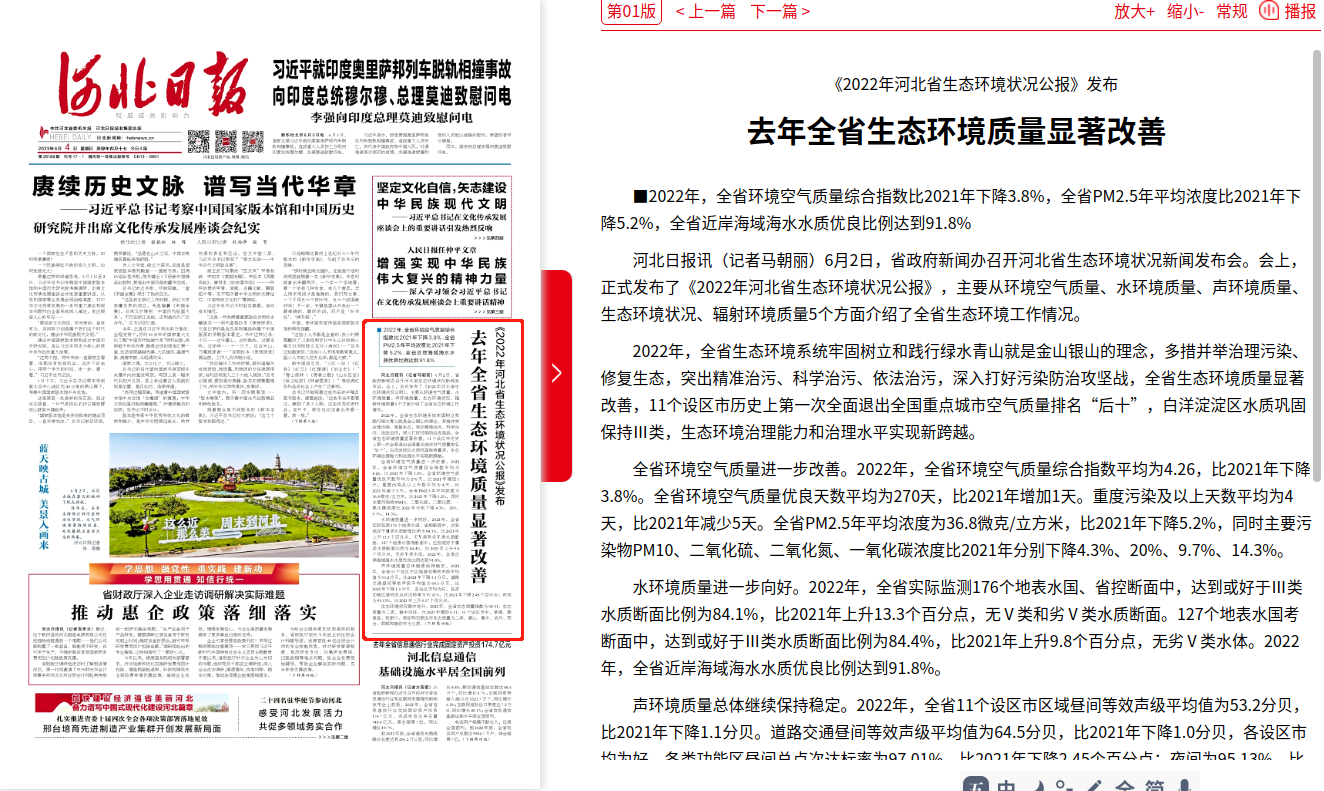 河北日报:《2022年河北省生态环境状况公报》发布  去年全省生态环境质量显著改善