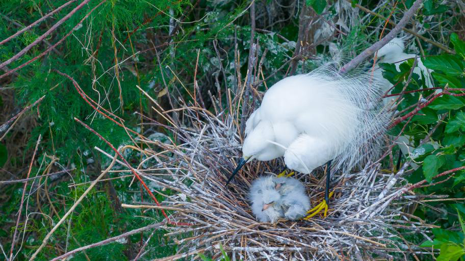 白鹭守护着巢中的幼鸟。