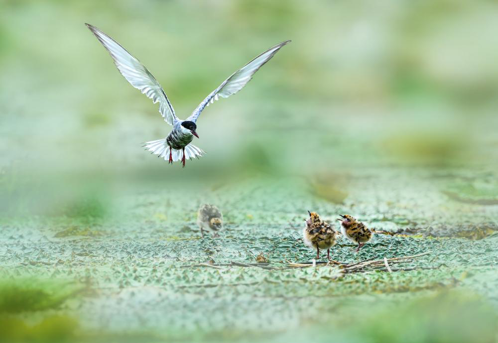 须孚鸥捕食归来,幼鸟们嗷嗷待哺。