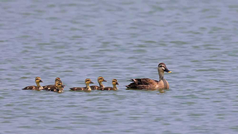 斑嘴鸭带着一队鸟宝宝从湖上游过。(韩卫 摄)