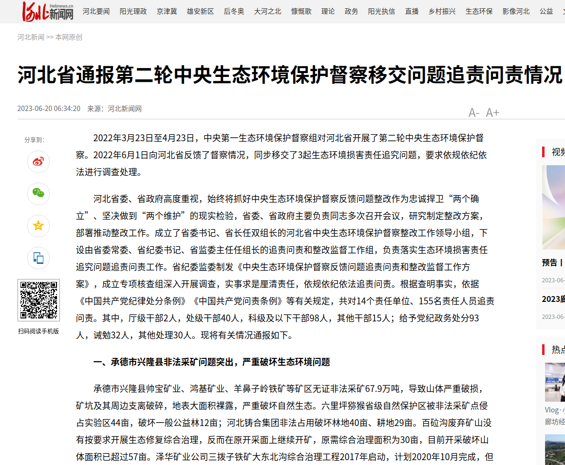 河北新闻网:河北省通报第二轮中央生态环境保护督察移交问题追责问责情况