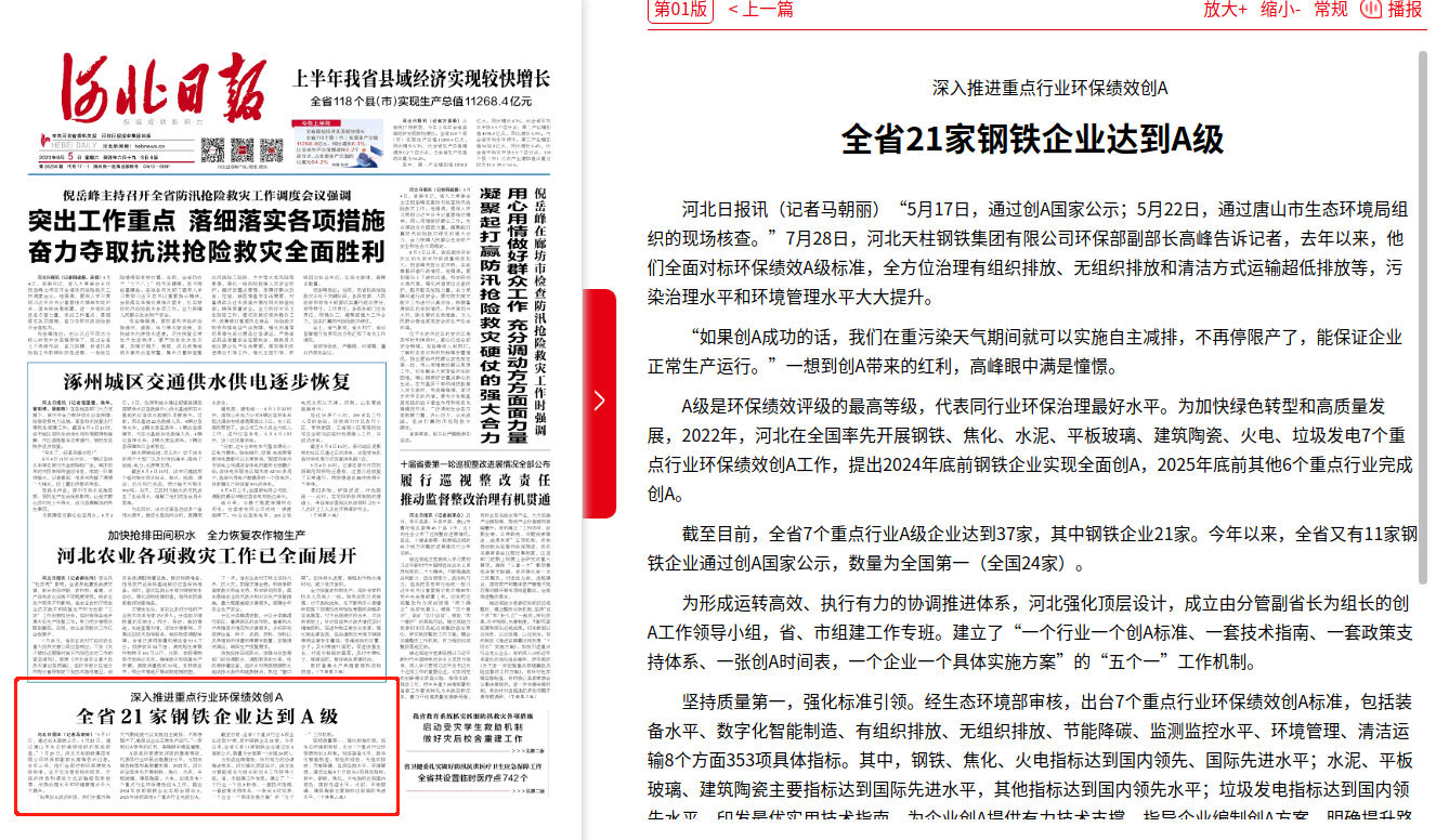 河北日报:深入推进重点行业环保绩效创A 全省21家钢铁企业达到A级