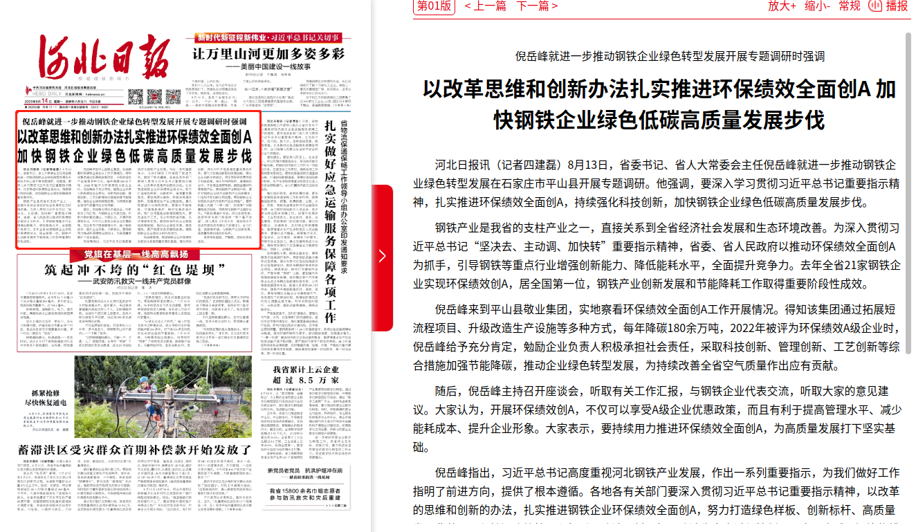 河北日报:倪岳峰就进一步推动钢铁企业绿色转型发展开展专题调研时强调 以改革思维和创新办法扎实推进环保绩效全面创A 加快钢铁企业绿色低碳高质量发展步伐