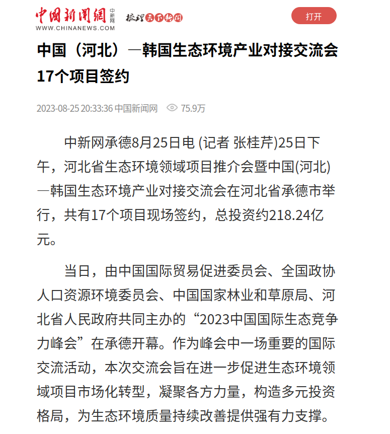 当日,由中国国际贸易促进委员会、全国政协人口资源环境委员会、中国国家林业和草原局、河北省人民政府共同主办的“2023中国国际生态竞争力峰会”在承德开幕。作为峰会中一场重要的国际交流活动,本次交流会旨在进一步促进生态环境领域项目市场化转型,凝聚各方力量,构造多元投资格局,为生态环境质量持续改善提供强有力支撑。