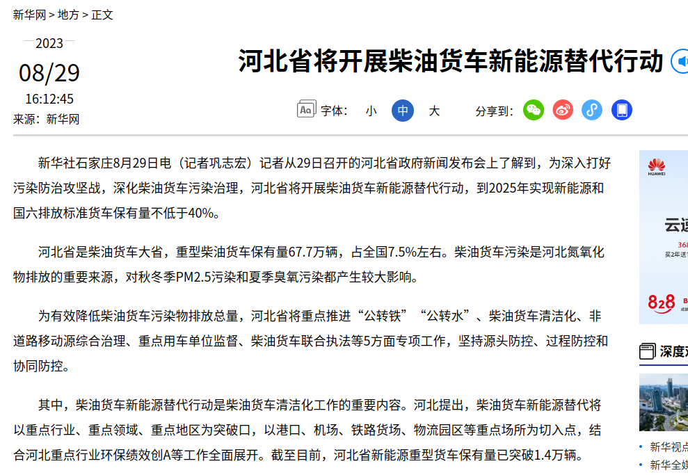 新华社石家庄8月29日电(记者巩志宏)记者从29日召开的河北省政府新闻发布会上了解到,为深入打好污染防治攻坚战,深化柴油货车污染治理,河北省将开展柴油货车新能源替代行动,到2025年实现新能源和国六排放标准货车保有量不低于40%。