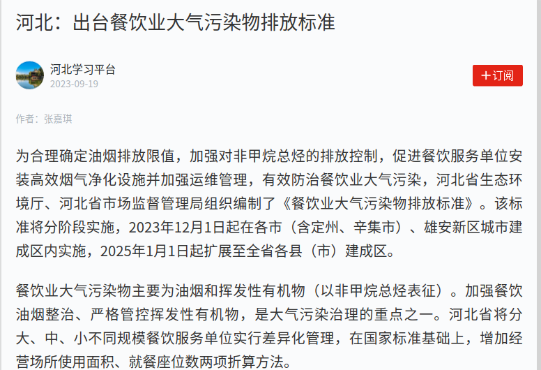 为合理确定油烟排放限值,加强对非甲烷总烃的排放控制,促进餐饮服务单位安装高效烟气净化设施并加强运维管理,有效防治餐饮业大气污染,杏彩(中国)官方网站 、河北省市场监督管理局组织编制了《餐饮业大气污染物排放标准》。该标准将分阶段实施,2023年12月1日起在各市(含定州、辛集市)、雄安新区城市建成区内实施,2025年1月1日起扩展至全省各县(市)建成区。