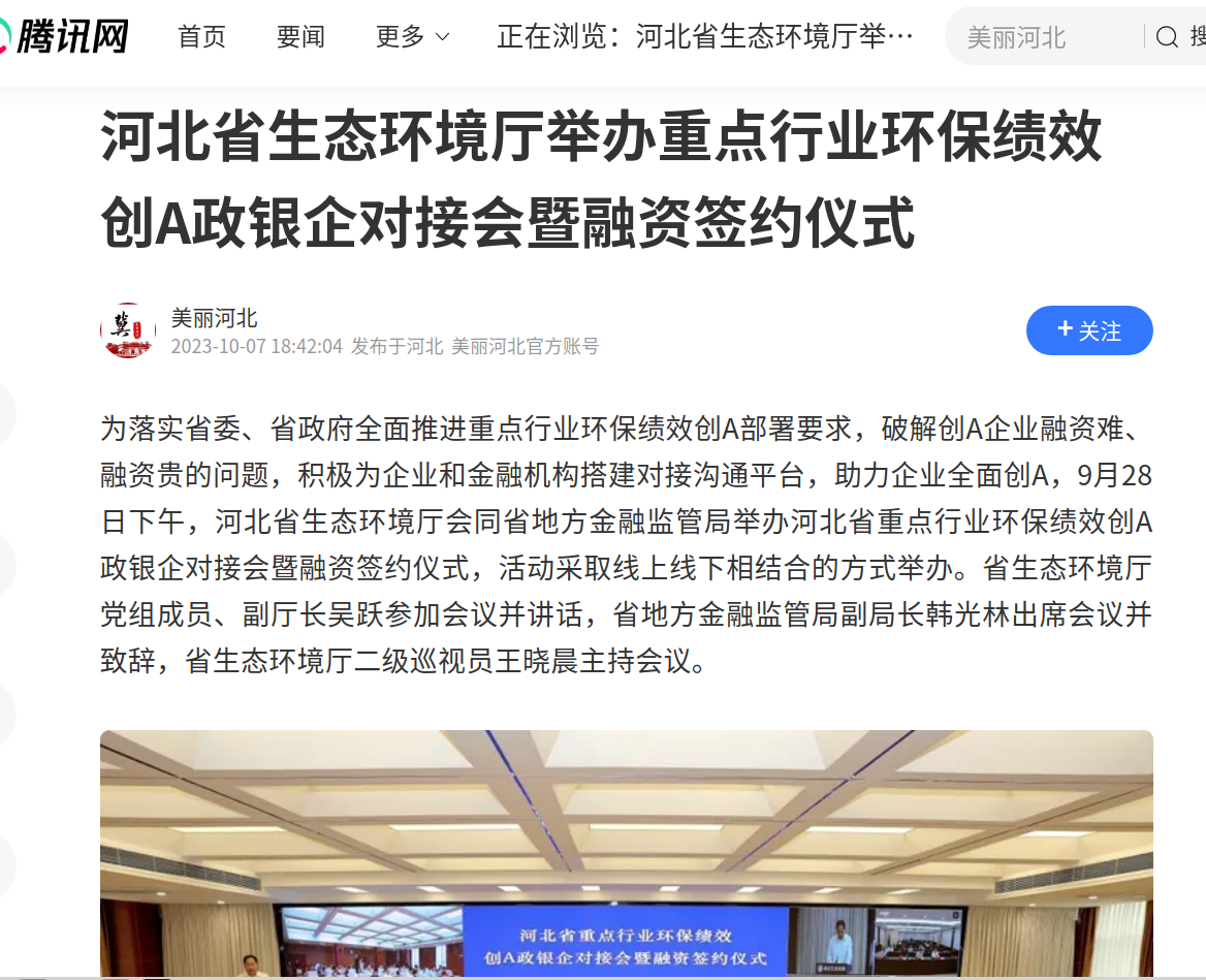 会同省地方金融监管局举办河北省重点行业环保绩效创A政银企对接会暨融资签约仪式,活动采取线上线下相结合的方式举办。杏彩(中国)官方网站