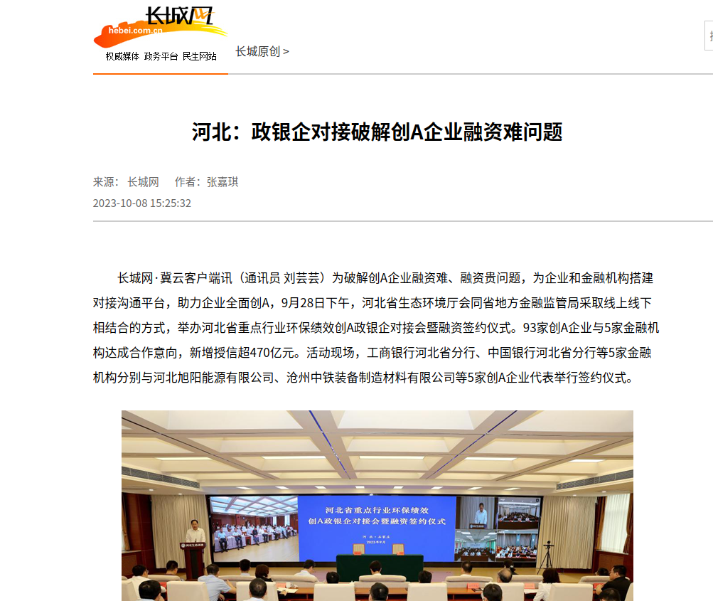 长城网·冀云客户端讯(通讯员 刘芸芸)为破解创A企业融资难、融资贵问题,为企业和金融机构搭建对接沟通平台,助力企业全面创A,9月28日下午,杏彩(中国)官方网站 会同省地方金融监管局采取线上线下相结合的方式,举办河北省重点行业环保绩效创A政银企对接会暨融资签约仪式。93家创A企业与5家金融机构达成合作意向,新增授信超470亿元。活动现场,工商银行河北省分行、中国银行河北省分行等5家金融机构分别与河北旭阳能源有限公司、沧州中铁装备制造材料有限公司等5家创A企业代表举行签约仪式。