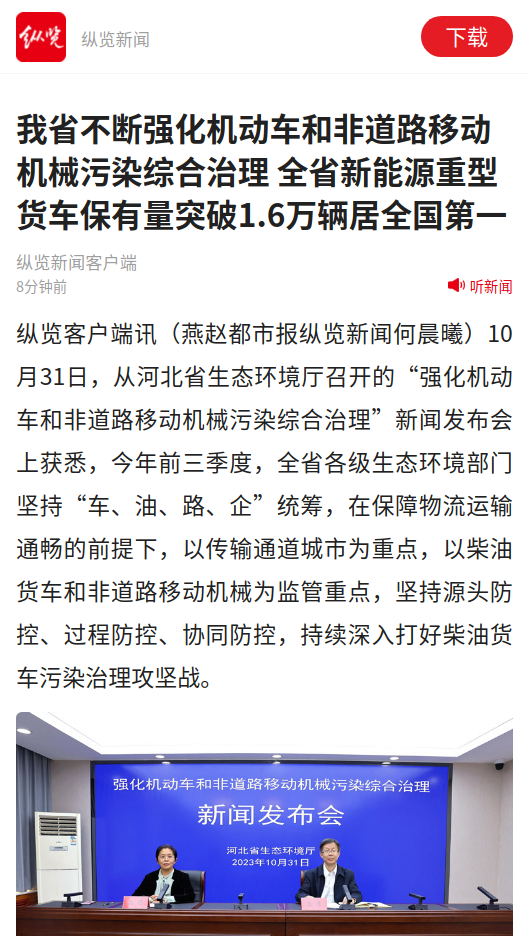 纵览新闻客户端:我省不断强化机动车和非道路移动机械污染综合治理 全省新能源重型货车保有量突破1.6万辆居全国第一