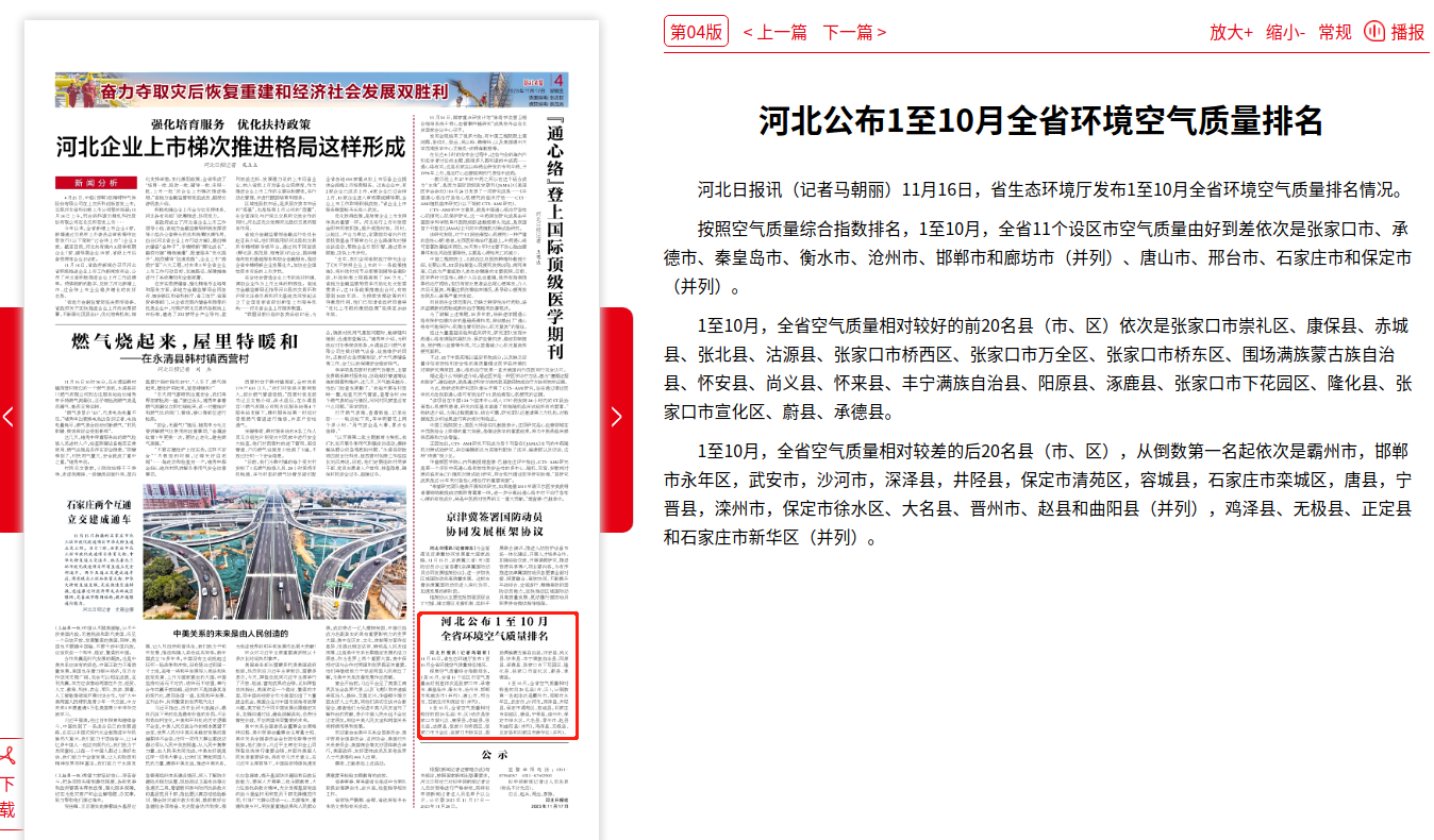 河北日报:河北公布1至10月全省环境空气质量排名