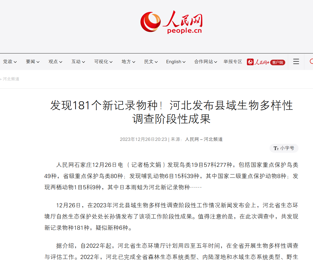 人民网:发现181个新记录物种!河北发布县域生物多样性调查阶段性成果